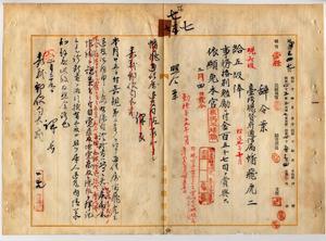 七 嘉義郵便局勤務ノ台湾総督府通信属幡飛虎二ハ疾病ニ罹リ職務ニ堪ヘサル旨ヲ以テ辞職願ニ依リ昇級ノ上事務格別勉励ニ付キ一時金ヲ賞与シ本官ヲ免ス