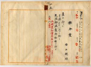 二五 台湾総督府民政部殖産局長高田元治郎ノ具申ニ依リ元関東都督府雇ノ安山親雄ニ雇ヲ命シ民政部殖産局勤務ヲ命ス