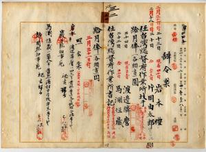 三二 台湾総督府作業所長賀来佐賀太郎ノ内申ニ依リ総督府作業所雇ノ岩本礼(三月三一日付)並ニ片岡由太郎(三月一八日付)ヲ台湾総督府作業所技手ニ任シ、同雇渡辺隣磨(三月三一日付)並ニ馬淵恒蔵(三月三一日付)ヲ台湾総督府作業所書記ニ任ス