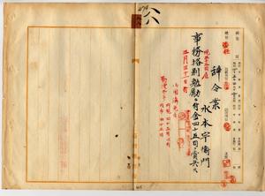 八八 台湾総督府民政部財務局長中川友次郎ノ内申ニ依リ雇水本宇衛門ハ事務格別勉励ニ付キ一時金ヲ賞与ス