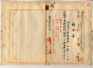 六 阿緱庁長佐藤謙太郎ノ内申ニ依リ元台湾小学校教諭二宮キシエニ在職中事務格別勉励ニ付キ一時金ヲ賞与ス