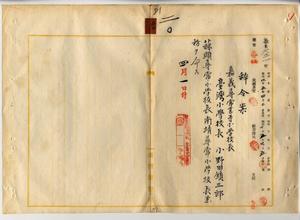 小學校長小野田鎮三郎(蒜頭尋常小學校長、南靖尋常小學校長兼務ヲ命ス)