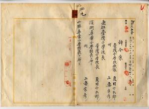 二九 台中庁長枝徳二ノ内申ニ依リ台湾小学校教諭夏目小太郎及ヒ台湾小学校教諭上妻宗彦ヲ台湾小学校長ニ兼任シ、台湾小学校長夏目小太郎ニ渓洲尋常高等小学校長ヲ命シ、台湾小学校長上妻宗彦ニ二林尋常高等小学校長ヲ命ス