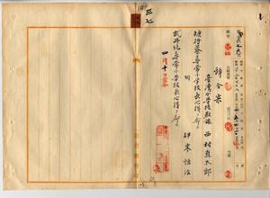 三七 台北庁長井村大吉ノ内申ニ依リ元基隆尋常高等小学校罵仔椙分教場勤務台湾小学校教諭西村直太郎ニ罵仔椙尋常小学校長心得ヲ命シ、元基隆尋常高等小学校武丹坑分教場勤務台湾小学校教諭伊東恒治ニ武丹坑尋常小学校長心得ヲ命ス