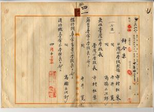 四一 台南庁長松木茂俊ノ内申ニ依リ台湾小学校教諭ノ市村松栄・平井寛・高橋三次郎ヲ台湾小学校長ニ兼任シ、台湾小学校長市村松栄ニ杉荳尋常小学校長ヲ命シ、台湾小学校長平井寛ニ橋仔頭尋常高等小学校長ヲ命シ、台湾小学校長高橋三次郎ニ港仔茄尋常高等小学校長ヲ命ス