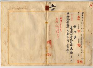 五四 台北庁長井村大吉ノ内申ニ依リ疾病ニ罹リ辞職ヲ出願シタル台北第一尋常高等小学校勤務台湾小学校教諭東條タツニ事務格別勉励ニ付キ一時金ヲ賞与ス