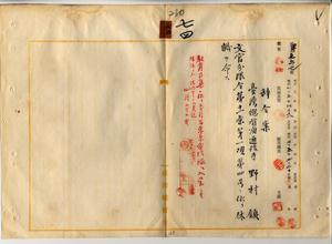 七四 打狗郵便局長鈴木重嶽ノ内申ニ依リ教育招集ノ為メ東京電信隊ヘ入営スル台湾総督府通信手野村鎮ニ文官分限令第一一条第一項第四号ニ依リ休職ヲ命ス