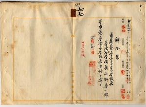 七七 阿緱庁長佐藤謙太郎ノ内申ニ依リ蕃薯椙尋常高等小学校長台湾小学校長上野喜一郎ニ手巾椙尋常小学校長兼務ヲ命ス