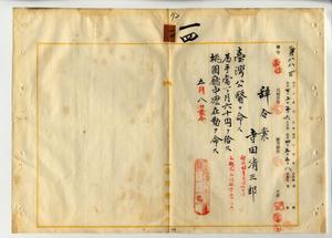 一四 台湾総督府民政部警察本署長亀山理平太ノ内申ニ依リ元新竹医院及ヒ桃園庁医務嘱託寺田清三郎ニ台湾公医ヲ命シ桃園庁中箇在勤ヲ命ス