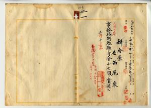 二一 台湾総督府民政部財務局長中川友次郎ノ内申ニ依リ御用済ニナリ雇ヲ免ズル台湾総督府雇西尾東ニ事務格別勉励ニ付キ一時金ヲ賞与ス