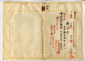 二六 台中庁長枝徳二ノ内申ニ依リ病気危篤ノ台中庁属田中彦一ニ事務格別勉励ニ付キ一時金ヲ賞与ス