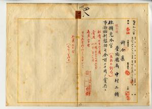 四八 台南庁属中村三輔ハ疾病ニ罹リ職ニ堪ヘサル旨ヲ以テ辞職願ニ依リ事務格別勉励ニ付キ一時金ヲ賞与シ本官ヲ免ス