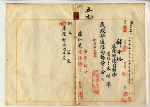 五九 台湾総督府民政部通信局長心得角源泉ノ内申ニ依リ基隆郵便局勤務通信手木村準ニ民政部通信局勤務ヲ命ス