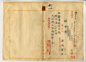 六一 台湾総督府民政部土木局長心得高橋辰次郎ノ内申ニ依リ民政部土木局勤務台湾総督府雇吉丸喜市ヲ台湾総督府属ニ任シ民政部土木局勤務ヲ命ス