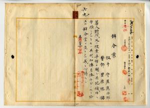 六九 台湾総督府民政部蕃務本署長大津麟平ノ内申ニ依リ台湾総督府技手守屋応治郎及ヒ台湾総督府警部豊原瑞穂カ蕃人討伐又ハ捜索事務ニ関シ其地域内ヘ出張シタルトキハ其期間加俸月俸一〇分ノ七ヲ給スル辞令書ヲ受ケタル件