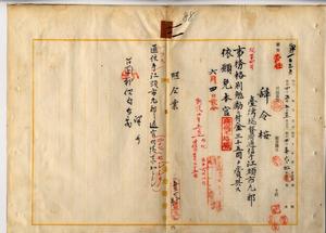 一一 台南郵便局勤務台湾総督府通信手江頭市九郎ハ麻拉里亜ニ罹リ職ニ堪ヘサル旨ヲ以テ事務格別勉励ニ付キ一時金ヲ賞与シ退官願ニ依リ本官ヲ免ス