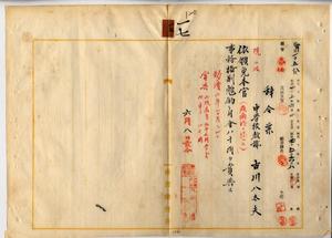 一七 台湾総督府中学校教諭古川八太夫ハ脚気ニ罹リ職ニ堪ヘサル旨ヲ以テ辞職願ニ依リ本官ヲ免シ事務格別勉励ニ付キ一時金ヲ賞与ス