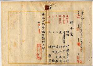 三五 台湾総督府民政部殖産局長高田元治郎ノ内申ニ依リ台湾総督府嘱託伊藤貞次郎、台湾総督府技手田中市二、台湾総督府雇ノ肝付兼有・満尾元親・山本精・林学周ニ第五回林業講習講師ヲ命ス