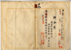 四九 南投庁長石橋亨ノ稟申ニ依リ南投庁警務課長南投庁警部渕辺元治ニ蕃務課長兼務ヲ命ス[次件五〇文書の電報問い合わせと回答あり]