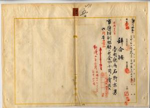 五〇 台南庁長松木茂俊ノ内申ニ依リ疾病ノ為メ退官ヲ出願シタル台南庁属石野末男ニ事務格別勉励ニ付キ一時金ヲ賞与ス