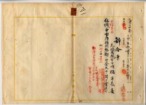 五一 桃園庁長西美波ノ内申ニ依リ疾病ノ為メ依願免官トナリタル元桃園庁警部補緒方辰喜ニ在職中事務格別勉励ニ付キ一時金ヲ賞与ス