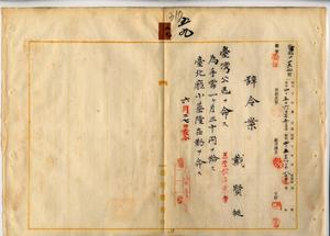 五九 台湾総督府民政部警察本署長亀山理平太ノ内申ニ依リ元台湾総督府花蓮港医院雇戴賢挺ニ台湾公医ヲ命シ台北庁小基隆在勤ヲ命ス
