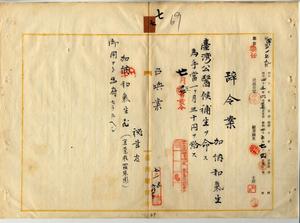 七 台湾総督府民政部警察本署長亀山理平太ノ内申ニ依リ宜蘭庁羅東堡羅東街台湾公医加納龍太郎方ニ於テ助手勤務中ノ加納和気生ニ台湾公医候補生ヲ命ス