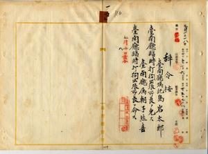 一五 台南庁長松木茂俊ノ内申ニ依リ台南庁嘱託島岩太郎ノ台南庁臨時打狗出張所長ヲ免シ、台南庁属朝子熊喜ニ台南庁臨時打狗出張所長ヲ命ス