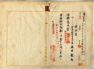 三三 台北郵便局勤務台湾総督府通信属麻田龍馬ハ疾病ニ罹リ職ニ堪ヘサル旨ヲ以テ辞職願ニ依リ本官ヲ免シ事務格別勉励ニ付キ一時金ヲ賞与ス