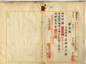 三八 阿緱庁属岩切茂三郎ハ脚気ニ罹リ職ニ堪ヘサル旨ヲ以テ辞職願ニ依リ昇級ノ上事務格別勉励ニ付キ一時金ヲ賞与シ本官ヲ免ス