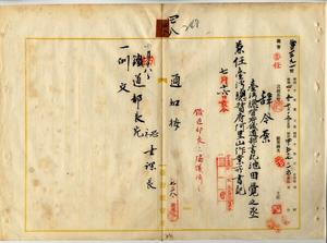 四八 台湾総督府阿里山作業所長事務取扱新元鹿之助ノ内申ニ依リ台湾総督府鉄道部書記池田覚之丞ニ台湾総督府阿里山作業所書記ヲ兼任ス