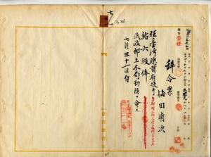 七一 台湾総督府民政部土木局長心得高橋辰次郎ノ内申ニ依リ京都帝国大学理工科大学大学選科修了梅田清次ヲ台湾総督府技手ニ任シ民政部土木部勤務ヲ命ス