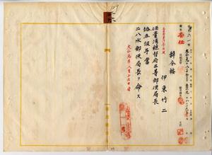 二六 台湾総督府民政部通信局長心得角源泉ノ内申ニ依リ伊東竹二ヲ台湾総督府三等郵便局長ニ任シ二八水郵便局長ヲ命ス