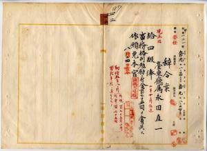 四二 台東庁属永田直一ハ疾病ニ罹リ職ニ堪ヘサル旨ヲ以テ辞職願ニ依リ事務格別勉励ニ付キ昇級ノ上一時金ヲ賞与シ本官ヲ免ス