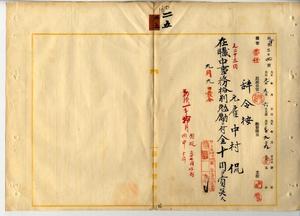 二五 台湾総督府民政部殖産局長高田元治郎ノ具申ニ依リ御用済解職ノ元台湾総督府雇中村侃ニ在職中事務格別勉励ニ付キ一時金ヲ賞与ス