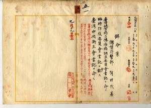 五一 台湾地方病及伝染病調査委員会長内田嘉吉ノ内申ニ依リ台湾総督府警部有田茂基ニ台湾地方病及伝染病調査委員会書記ヲ命シ、台湾総督府防疫委員会長内田嘉吉ノ内申ニ依リ台湾総督府警部有田茂基ニ臨時防疫委員会書記ヲ命シ、台湾中央衛生会長内田嘉吉ノ内申ニ依リ台湾総督府警部有田茂基ニ台湾中央衛生会書記ヲ命ス