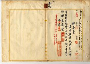 五六 台南庁属氏平荒四郎ハ疾病ニ罹リ職ニ堪ヘサル旨ヲ以テ辞職願ニ依リ事務格別勉励ニ付キ一時金ヲ賞与シ本官ヲ免ス