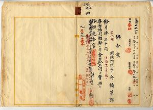 九四 台湾総督府測候所技手船橋策郎ハ疾病ニ罹リ職ニ堪ヘサル旨ヲ以テ辞職願ニ依リ昇給ノ上事務格別勉励ニ付キ一時金ヲ賞与シ本官ヲ免ス