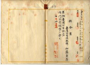 一九 阿緱庁長佐藤謙太郎ノ内申ニ依リ台湾公学校教諭加藤貞房ニ台湾公学校長ヲ兼任シ内門公学校長ヲ命ス