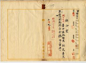 三四 台中庁長枝徳二ノ内申ニ依リ疾病ノ為メ退官ヲ出願シタル台中庁税務吏紀光喜美ニ事務格別勉励ニ付キ一時金ヲ賞与ス