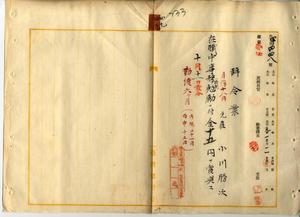 四九 台湾総督府民政部殖産局長高田元治郎ノ具申ニ依リ元台湾総督府雇小川勝次ニ在職中事務格別勉励ニ付キ一時金ヲ賞与ス