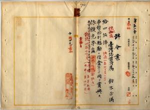 六七 台湾総督府民政部財務局勤務台湾総督府属鈴木正満ハ疾病ニ罹リ職ニ堪ヘサル旨ヲ以テ辞職願ニ依リ昇級ノ上事務格別勉励ニ付キ一時金ヲ賞与シ本官ヲ免ス