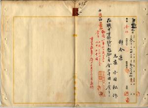 八八 台湾総督府民政部殖産局長高田元次郎ノ具申ニ依リ元台湾総督府雇小田耘作ニ在職中事務格別勉励ニ付キ一時金ヲ賞与ス