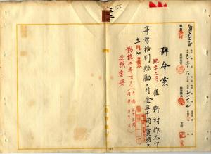 三二 台湾総督府民政部財務局長中川友次郎ノ内申ニ依リ辞職願出ノ雇野村作太郎ニ事務格別勉励ニ付キ一時金ヲ賞与ス