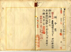 六九 台湾総督府民政部通信局勤務台湾総督府通信手田村要治郎ハ疾病ニ罹リ職ニ堪ヘサル旨ヲ以テ辞職願ニ依リ事務格別勉励ニ付キ一時金ヲ賞与シ本官ヲ免ス