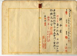 三八 台中庁属三砂和三郎ハ疾病ニ罹リ職ニ堪ヘサル旨ヲ以テ辞職願ニ依リ本官ヲ免シ事務格別勉励ニ付キ一時金ヲ賞与ス