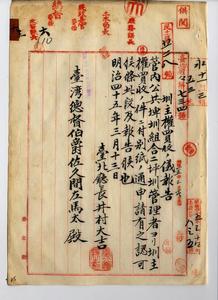 六 公共課嘩組合二坪嘩管理者台北庁長井村大吉ヨリ本嘩開鑿者ノ子孫台北庁金包里堡下中股庄土名金包里街ノ何義成ト同庁同堡中万里加投庄土名大坪ノ何九硯ヨリ嘩主権ヲ金百円ヲ以テ買収スル契約ニ付キ申請認可ノ旨台北庁長井村井大吉ヨリ報告ノ件