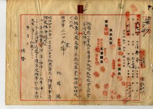 一 桃園庁長西美波ヨリ稟申アリタル台北庁大加蚋崔崢堡将軍廟街ノ三井合名会社台湾出張所星野政敏ヨリ願ヒ出テノ桃園庁海山堡公館後庄土名公館后ノ田及ヒ建物ヲ桃園尋常高等小学校三角湧分教場用敷地及ヒ校舎宿舎トシテ寄附ニ付キ受納ノ旨認可ノ件(指令第二一〇九号)