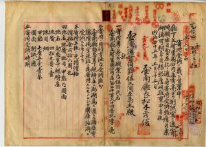 九 李亮ヨリ願ヒ出テノ台南庁効忠里下鯤葮庄ノ畑ヲ海底電線陸揚室建設敷地トシテ寄附アリタルニヨリ受納シタルニ付キ台南庁長松木茂俊ヨリ報告ノ件