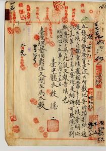 一三 業主林番升外九名[未記載]総代林蕃升ヨリ願ヒ出テノ台中庁藍興堡五張犁庄ノ田ヲ五張犁警察官吏派出所敷地トシテ寄附アリタルニヨリ受納シタルニ付キ台中庁長枝徳二ヨリ報告ノ件